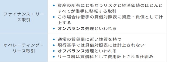 1.「リース取引の区分廃止」と「基本は全てオンバランス処理」 現行のリース会計基準におけるリース取引は、ファイナンスリースとオペレーティングリースに区分されていますが、新リース会計基準ではIFRSの「ものを使用する権利はすべて均等に考える」という概念が採用され、取引区分がなくなります。