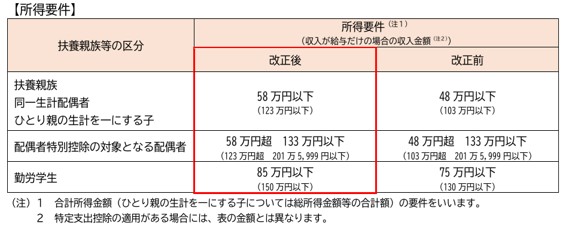 (1)の基礎控除の改正に伴い、扶養控除等の対象となる扶養親族等の所得要件が改正されました。