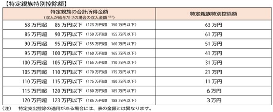 居住者が特定親族を有する場合には、その居住者の総所得金額等から、その特定親族1人につき、その特定親族の合計所得金額に応じて次の金額を控除する特定親族特別控除が創設されました。