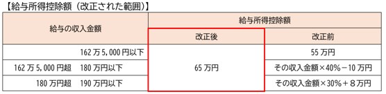 給与所得控除について、55万円の最低保障額が65万円に引き上げられました。