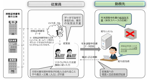 従業員側のメリットとしては、手続きの簡便化が挙げられます。 従来、紙の申告書に記入する際は、控除額の計算や必要項目の記載漏れが発生しやすく、記入方法がわからないことで担当者へ問い合わせるケースも少なくありませんでした。 また、生命保険料控除証明書なども紙で提出する場合、紛失や提出忘れが起こりがちです。電子化すれば、Web上でガイドに従って入力できるため記入漏れが防止でき、控除額計算も自動で行われるため計算間違いの心配がありません。 さらに、マイナポータルに対応する保険会社から電子データとして控除証明書をまとめて取得できるため、紙で保管する必要がなく、紛失しても再取得しやすいという利便性もあります。