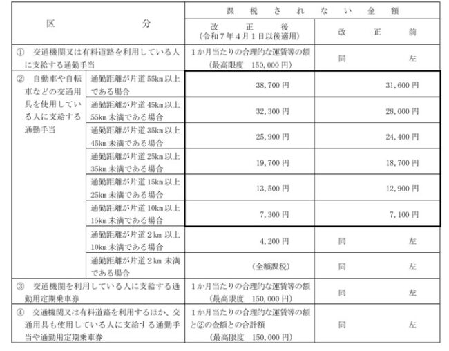 令和7年11月19日に所得税法施行令の一部を改正する政令が公布され、通勤のため自動車などの交通用具を使用している給与所得者に支給する通勤手当の非課税限度額が引き上げられました。         この改定は、令和7年11月20日に施行され、令和7年4月1日以後に支払われるべき通勤手当(同日前に支払われるべき通勤手当の差額として追加支給するものを除きます。)について適用されます。改正前に、改正前の非課税限度額を超えた通勤手当を支払っていた場合には、令和7年分の年末調整で対応が必要となることがあります。                                                                                     改正後の1か月当たりの非課税限度額は、次のとおりです。